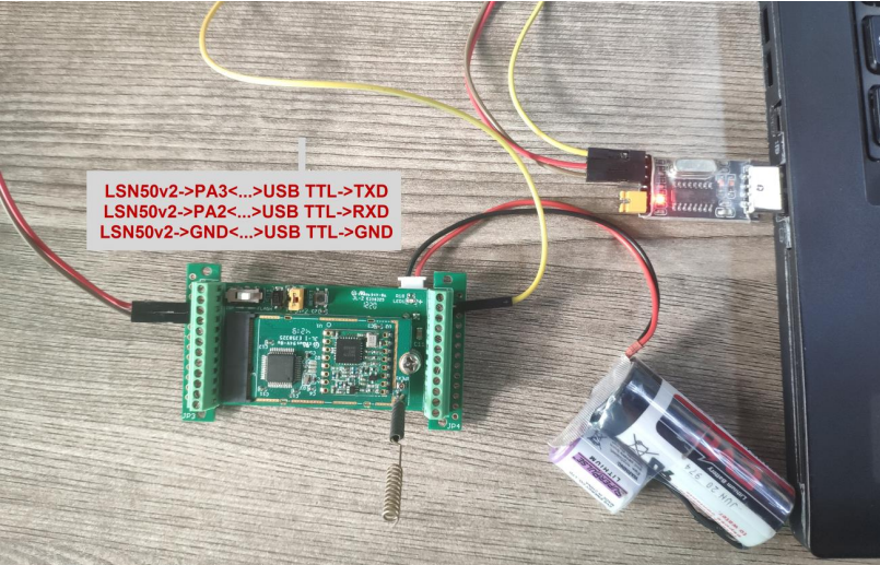| Fig.: A USB-to-Serial Converter (here UARTSBee by Seeedstudio) connected to LSE01. |
