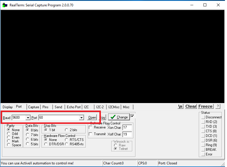 Open the com port with your terminal (baud rate: 9600).