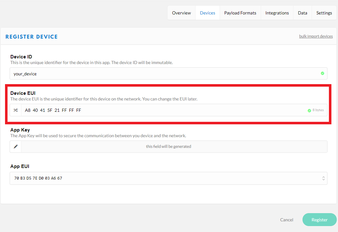 When the TTN application is created successfully it allows to register devices. Each device has a unique Device EUI. This can be taken from the LSE01/LSN50 settings and filled in into the respective field during device registration.